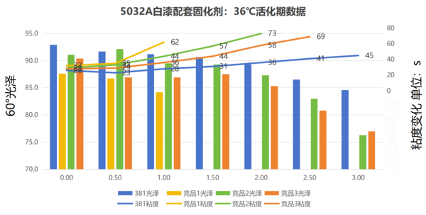 摆杆硬度 长活化期 Houxian®381搭配市场上或我司的羟丙二级分散体,都能更好地延长活化期。 测试条件:36℃水浴,敞开 搭配花果山树脂5032A 与市面上同类固化剂的活化期对比: